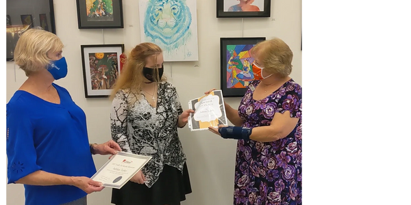 FLCAC President, Doris Jean Young and LCAC staff member, Helen Dupuis present the 2021 Youth Art Month Best in Show award and scholarship to Ashton Turley of South Brunswick High School.