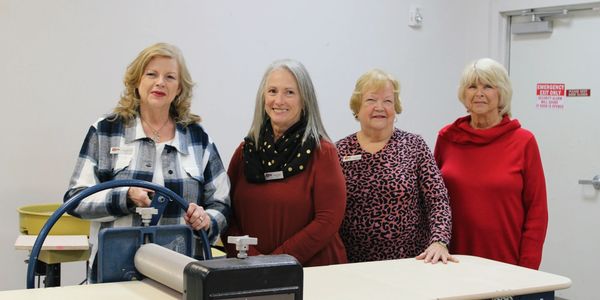 FLCAC Board members present a new slab roller to the LCAC ceramic studio, purchased to enhance the experience for both instructors and participants.